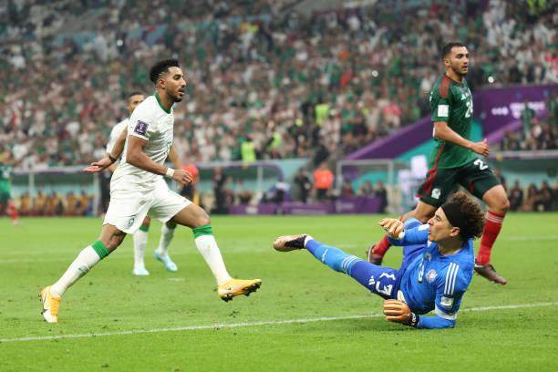 第7分钟,墨西哥队左路半高球传入禁区,沙特门将奥韦斯抢在亨利·马丁冲顶之前双掌将球击出。